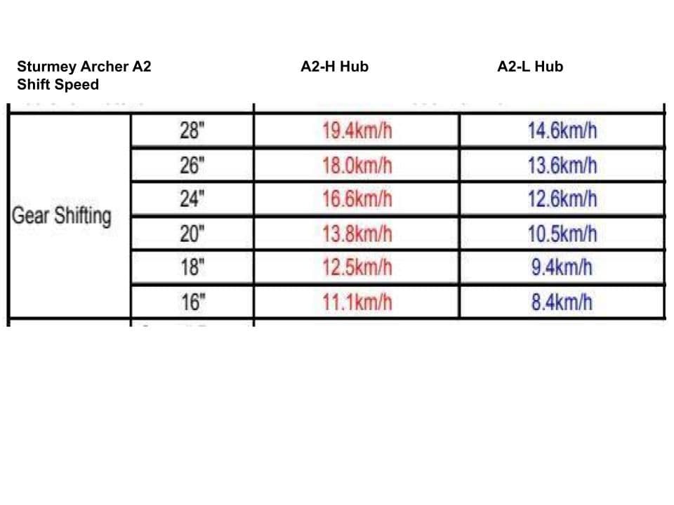 Automatic version of the S2 Kick Shift hub. The A2K shifts gear automatically according to the pedal cadence. Speed of shift is controlled by the wheel RPM so the road speed at which the shift occurs will vary with wheel size. Please see second image to see approx change speed for the two models.
